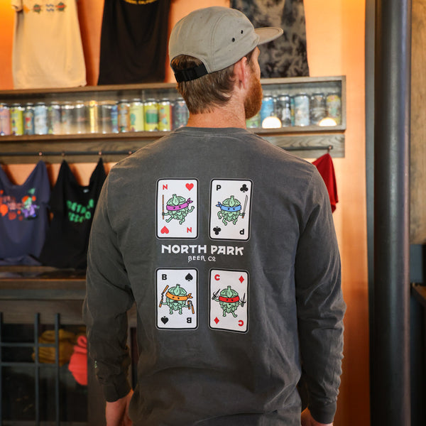 Disciples of Fu! return as a specialty set of House of Fu! playing cards on a soft long sleeve t-shirt. One NPBC card on the front pocket, with all 4 Disciples on the back along with our logo. Additional Triangle logo on left sleeve.