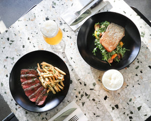 - Your choice of Flat Iron Steak and pomme frites or Seared Salmon Filet with warm potato and arugula salad.